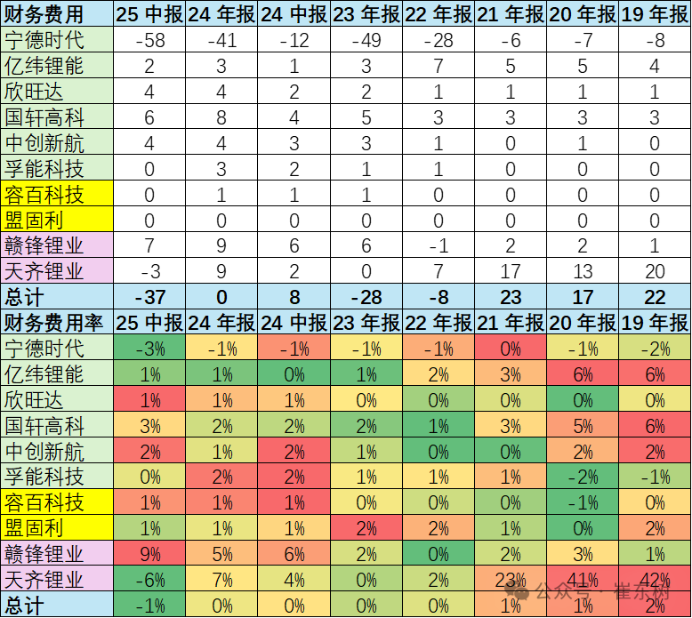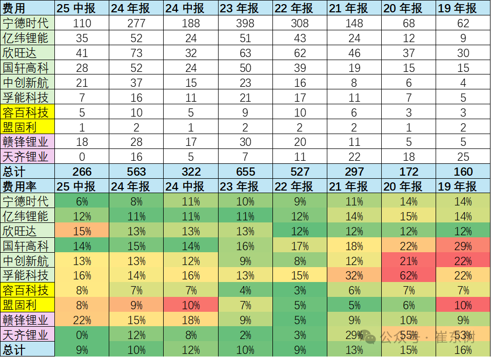电池企业的三项费用,包含销售费用,管理费用,还有财务费用。2025年上半年电池上市公司总体费用266亿元,同比下降16%,费用降低效果很好。其中费用增长相对比较大的应该是矿业,赣锋锂业费用率22%,天齐锂业的费用率下降到0%,分化明显。