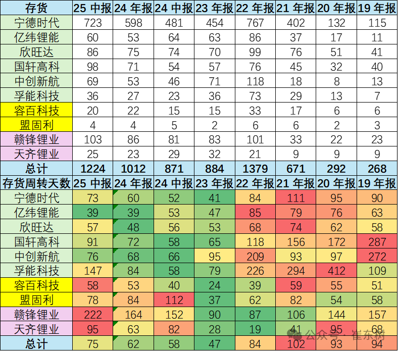 2025年主力电池企业的库存周转天数增大,这也是产业供需改善带来的电池库存增长。总体电池行业库存75天,较去年同期的58天提升17天。其中宁德时代的电池库存天数从52天上升到73天,国轩高科从去年的58天上升到91天,孚能电池的升幅最明显。