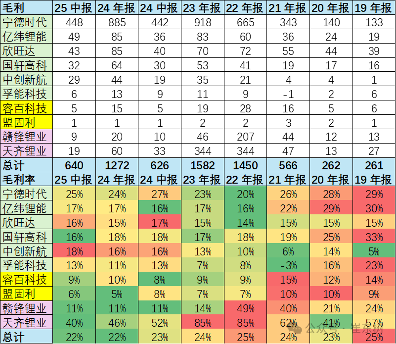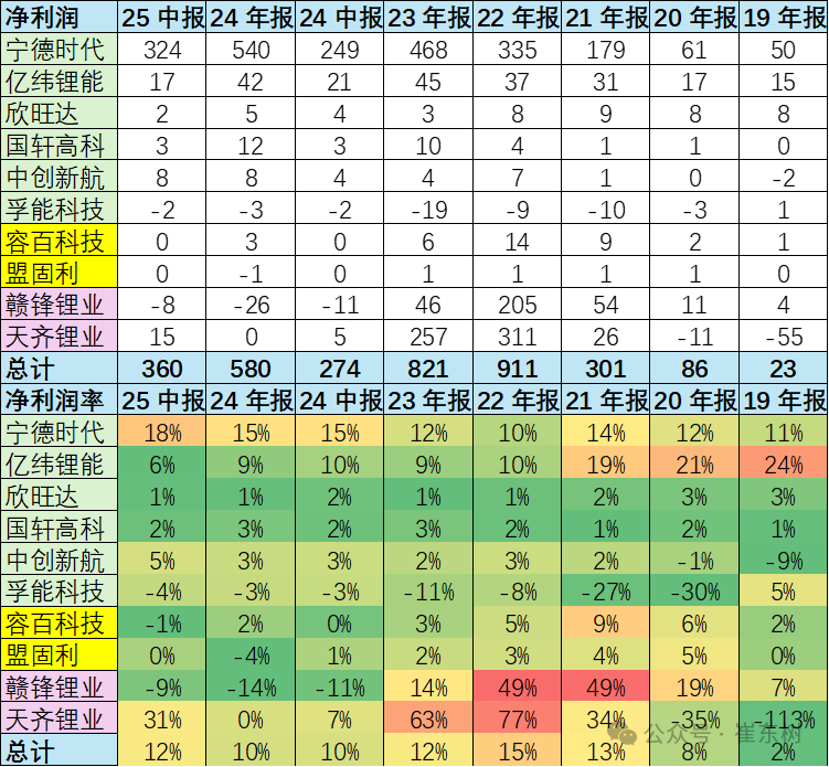 10月8日,乘联分会秘书长崔东树发文称,在2025年,尽管新能源电池产业链整体营收和利润同比增长放缓,但锂电池环节更体现为锂电行业最盈利的环节,分走了产业链七成的利润。具体到企业层面,宁德时代(03750)和亿纬锂能(300014.SZ)等企业在2025年上半年的净利润同比增长,显示出行业内的分化。宁德时代上半年毛利率25%,净利润的显著增长。相对于整车企业的惨烈竞争和矿端的剧烈价格波动,电池企业的产业高利润优势明显。
