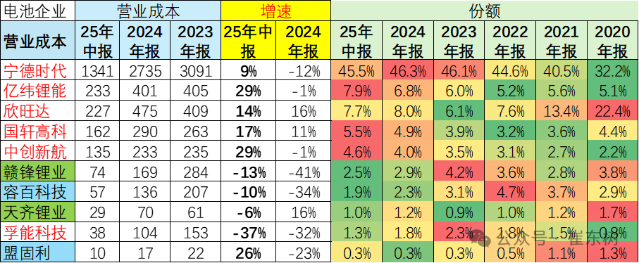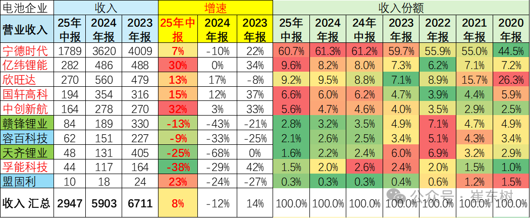 而在上游的正极材料,整体出现了10%左右的下滑幅度,容百科技等表现收入明显下降,而天齐锂业、赣峰锂业等下降幅度尤为明显。尤其天齐锂业2025年上半年下降了25%,只有48亿元的水平。